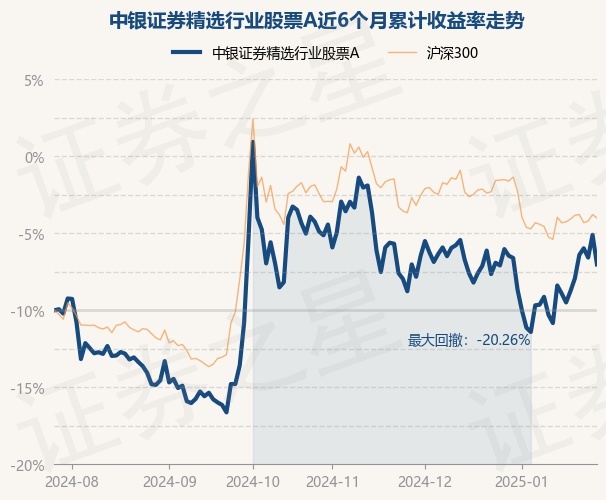 本站消息,1月27日,中银证券精选行业股票A最新单位净值为0.3948元,累计净值为0.3948元,较前一交易日下跌3.5%。历史数据显示该基金近1个月下跌1.05%,近3个月下跌5.53%,近6个月上涨5.96%,近1年下跌0.33%。该基金近6个月的累计收益率走势如下图: